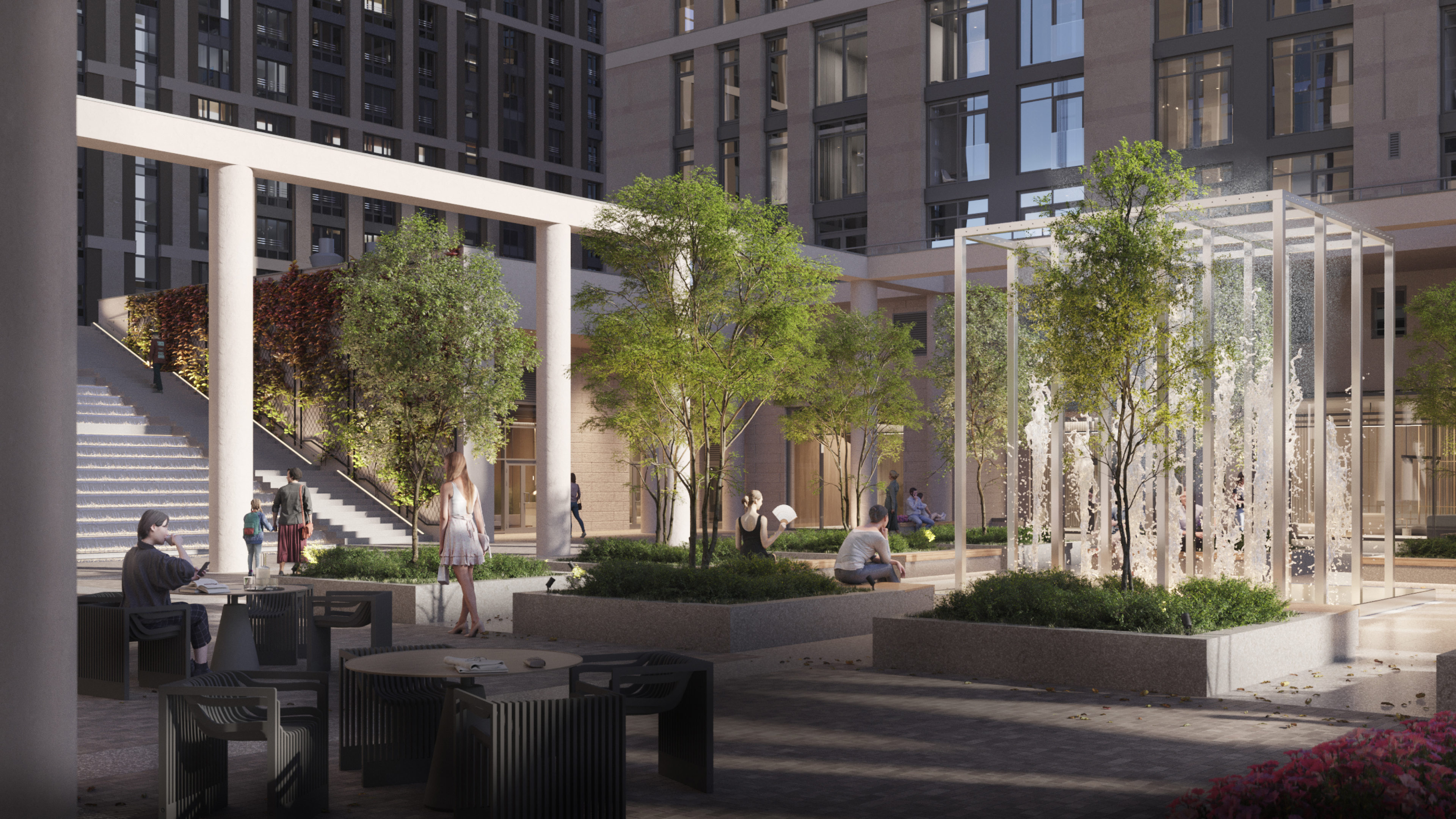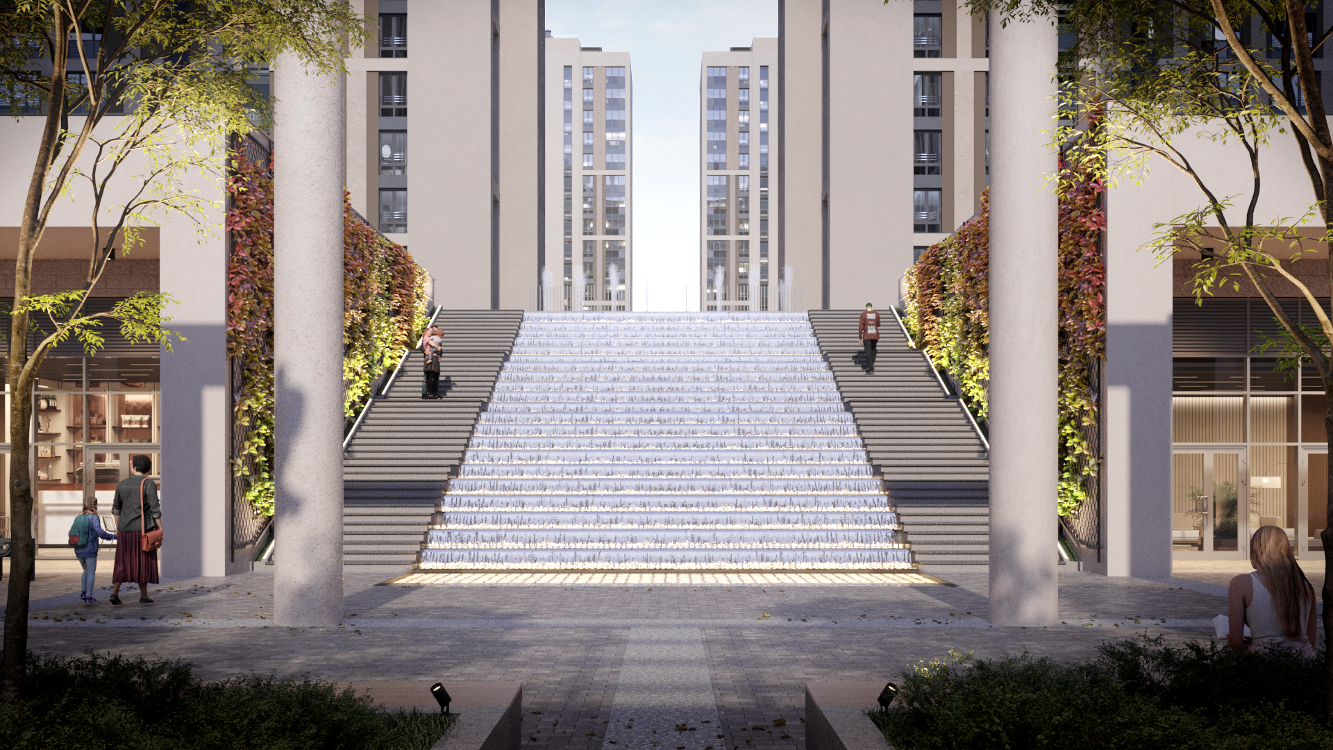 А на уровне 3-го этажа расположился сухой фонтан, его струи